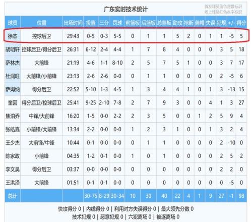 此外,还有一个重要的因素,那就是球队主力后卫徐杰表现太糟糕,完全没有体现出来真实水平。本场比赛,徐杰首发出场,一共打了29分43秒,然而,在这么长的时间里,徐杰5投0中,命中率为0%,十分尴尬。好在通过罚球得了5分,不然,徐杰真的是没脸见人了。