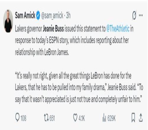 随后珍妮-巴斯委托TA记者萨姆-阿米克对ESPN的长文辟谣:鉴于LBJ为湖人所做的一切,他被卷入了我的家族纷争这太离谱了。ESPN的报道并不真实,对LBJ来说也太不公平。