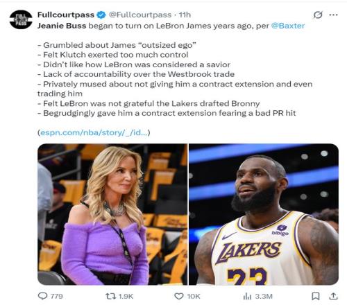 北京时间今日,ESPN记者Baxter Holmes撰文表示,湖人前老板珍妮巴斯近些年来逐渐疏远詹姆斯,认为其太过自负,喜欢...